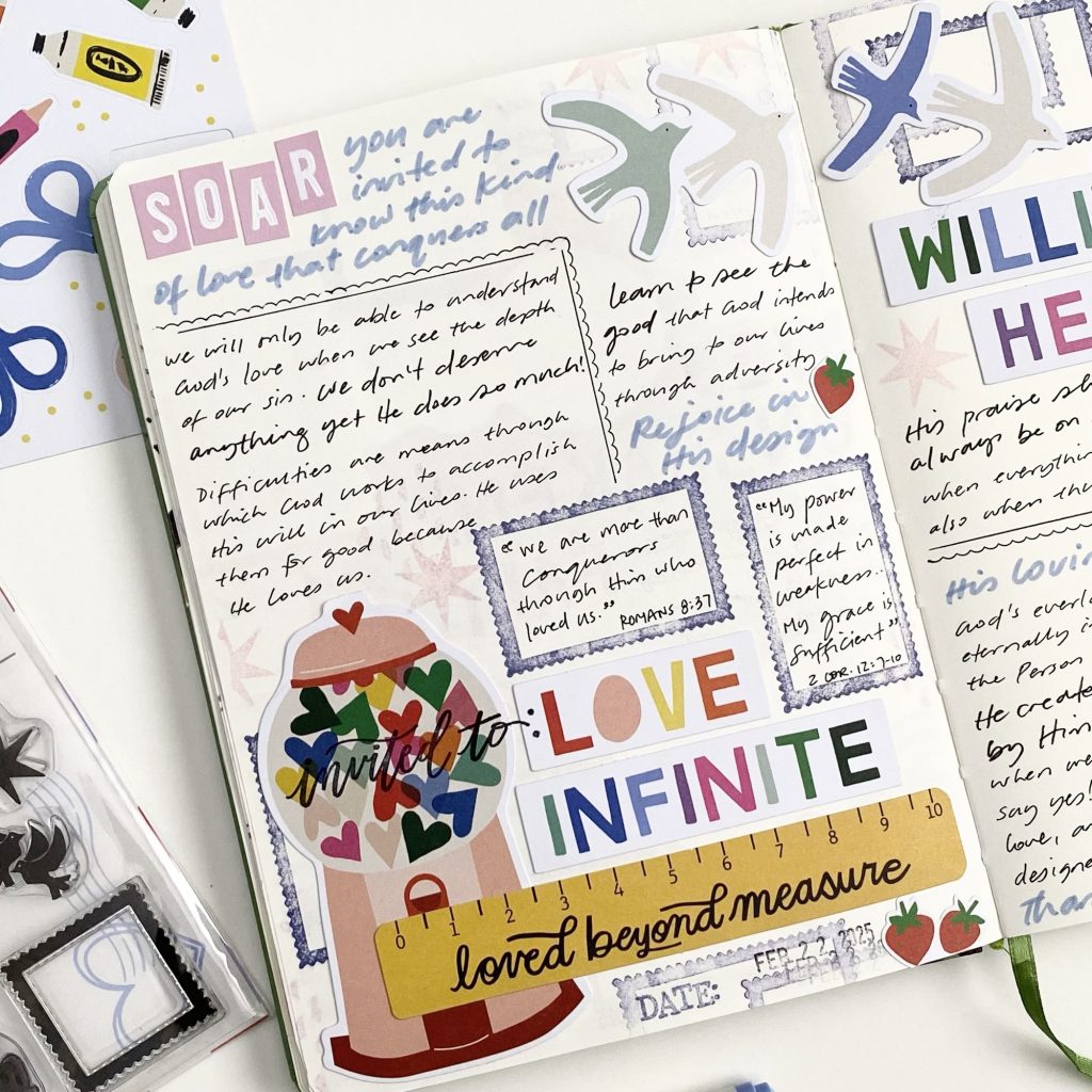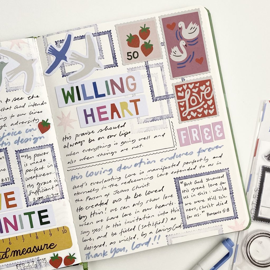 These pages are in a basic, blank, A5 notebook that I use for faith journaling. I used items from the devotional kit by Illustrated Faith for February 2025 which is called “Invited”. It was written by Isabela Schielke who is @isabelaschielkestudio on Instagram.