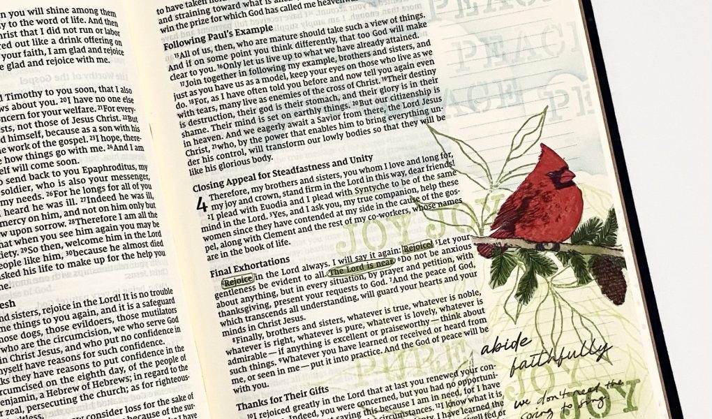 I stamped the words “abide faithfully” from Mindful Magnolias below the bird. Then, finished by highlighting the text and adding a prayer.