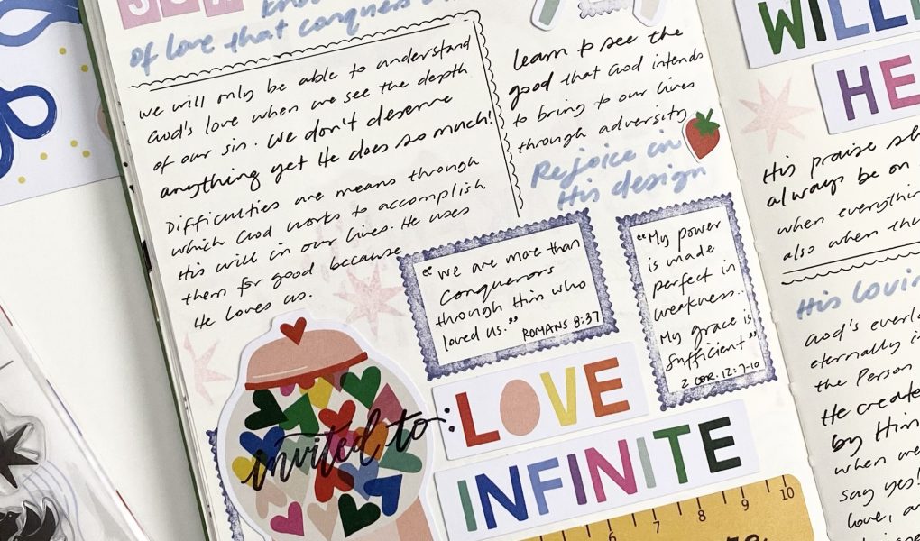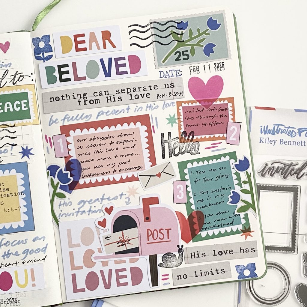 These pages are in a basic, blank, A5 notebook that I use for faith journaling. I used items from the devotional kit by Illustrated Faith for February 2025 which is called “Invited”. It was written by Isabela Schielke who is @isabelaschielkestudio on Instagram.