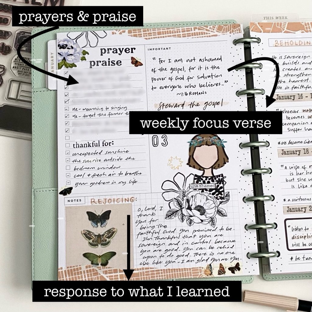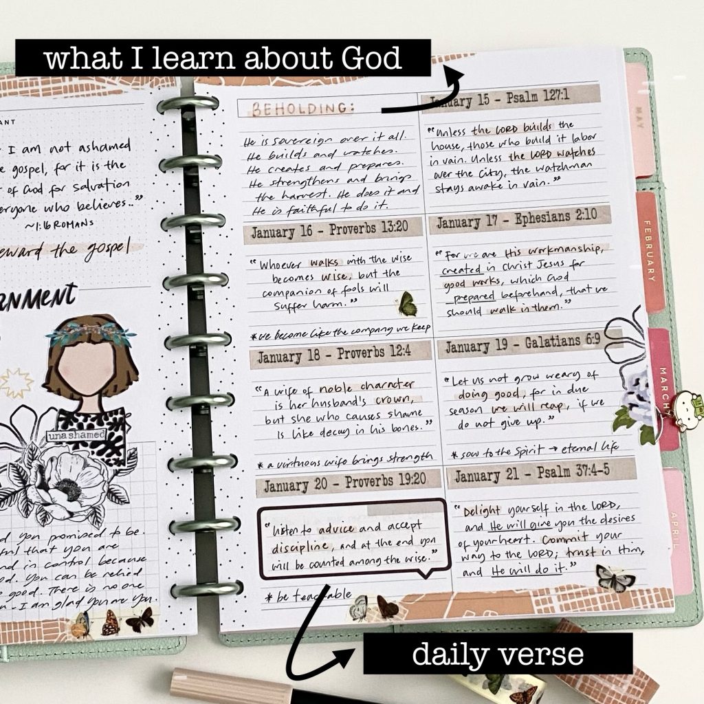 In the Looking Ahead section, I usually have some decor. I’m a visual person and this makes my planner more inviting and pleasant to use. I particularly like to include a beloved as it reminds me of my identity in Christ. Most of the decor pictured are included in the scripture plan except the beloved. They’re from a printable by Beloved Society for Illustrated Faith and can be found here: Proverbs 31 girls. There are many more sets available and they may be found by browsing through the Beloved Society category.