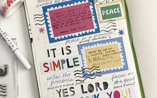 I used the Vintage Ledger Page stamp to add a journaling spot for a prayer. I also stamped it in the upper left to add some texture to the page. Lastly, I added some washi for colour, and coloured in the word “praise” with a matching pencil crayon.