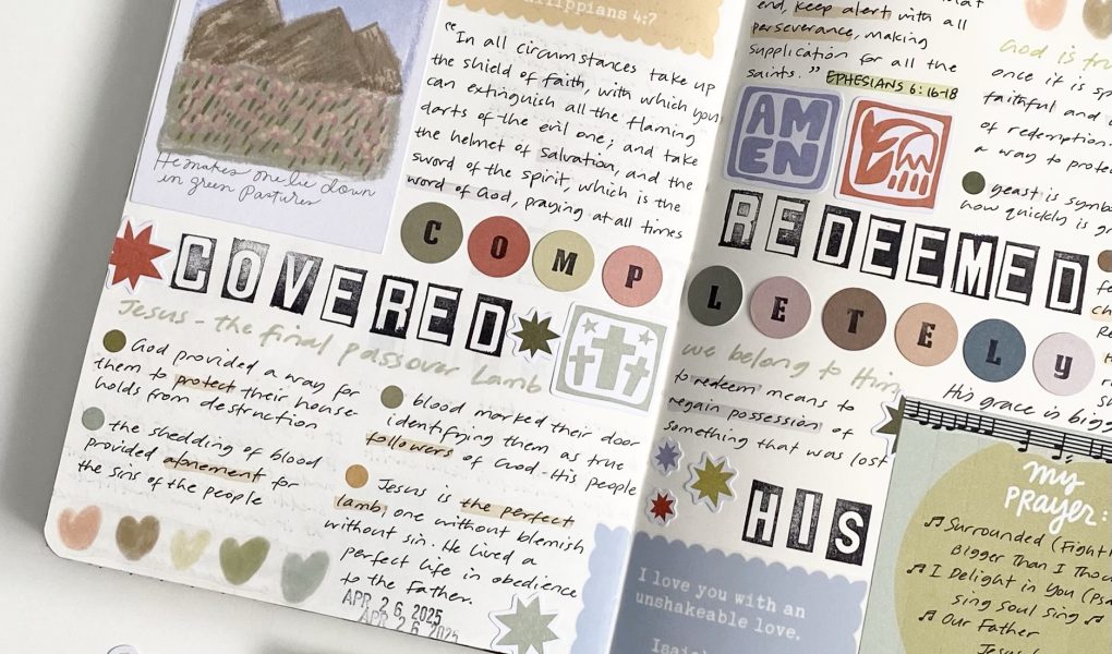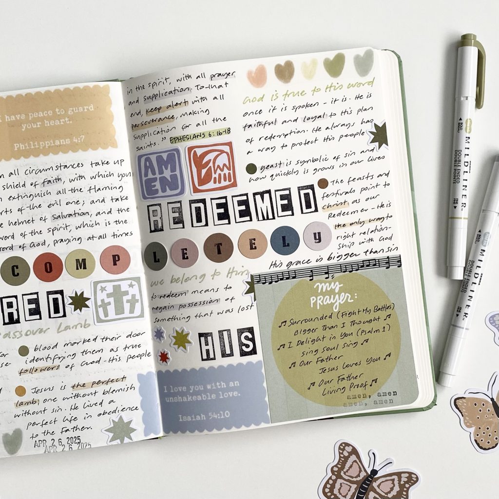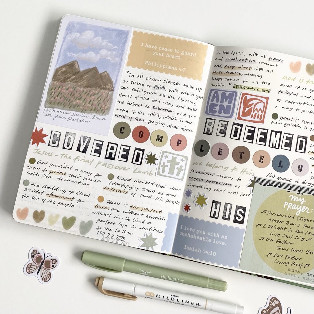 These pages are in a basic, blank, A5 notebook that I use for faith journaling. I used the devotional kit by Illustrated Faith for April 2025 which is called “Forever Redeemed” and is written by Christy Sheffield who is iamwonderfullycomplex on Instagram.