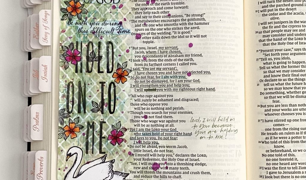 It’s hard to describe the process for this page because it took many steps and layers of trial and error. There was heavy shadowing on this side of the page because of the art on the page before it. So, I started by applying some acrylic paint in white and beige to cover that. I stamped the Joshua 1:9 stamp in blue ink over that which made the background look very busy. So, I applied more white paint over that to mute it somewhat. It still didn’t look right but I left it for the moment and moved on.