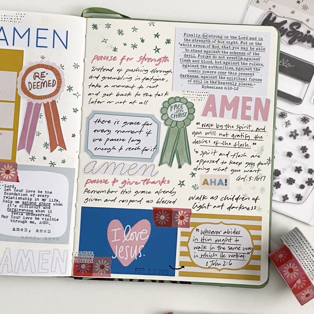 As I sat down to journal these pages, the Holy Spirit brought to mind lessons on “the power of the pause” from the Rest Here devotional which I journaled through last year. I remembered that God uses pauses to invite us to draw near for a heart check. And I reflected on recent moments where the Holy Spirit led me to pause a bit.