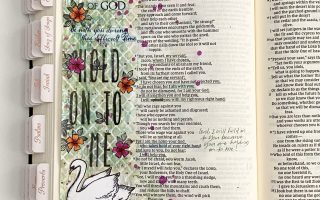 As with the other page, I used the Peace Joy Love stencil to add the word “abide” in the same inks as the background. Then, I finished by underlining the verses that stood out to me using a marker.